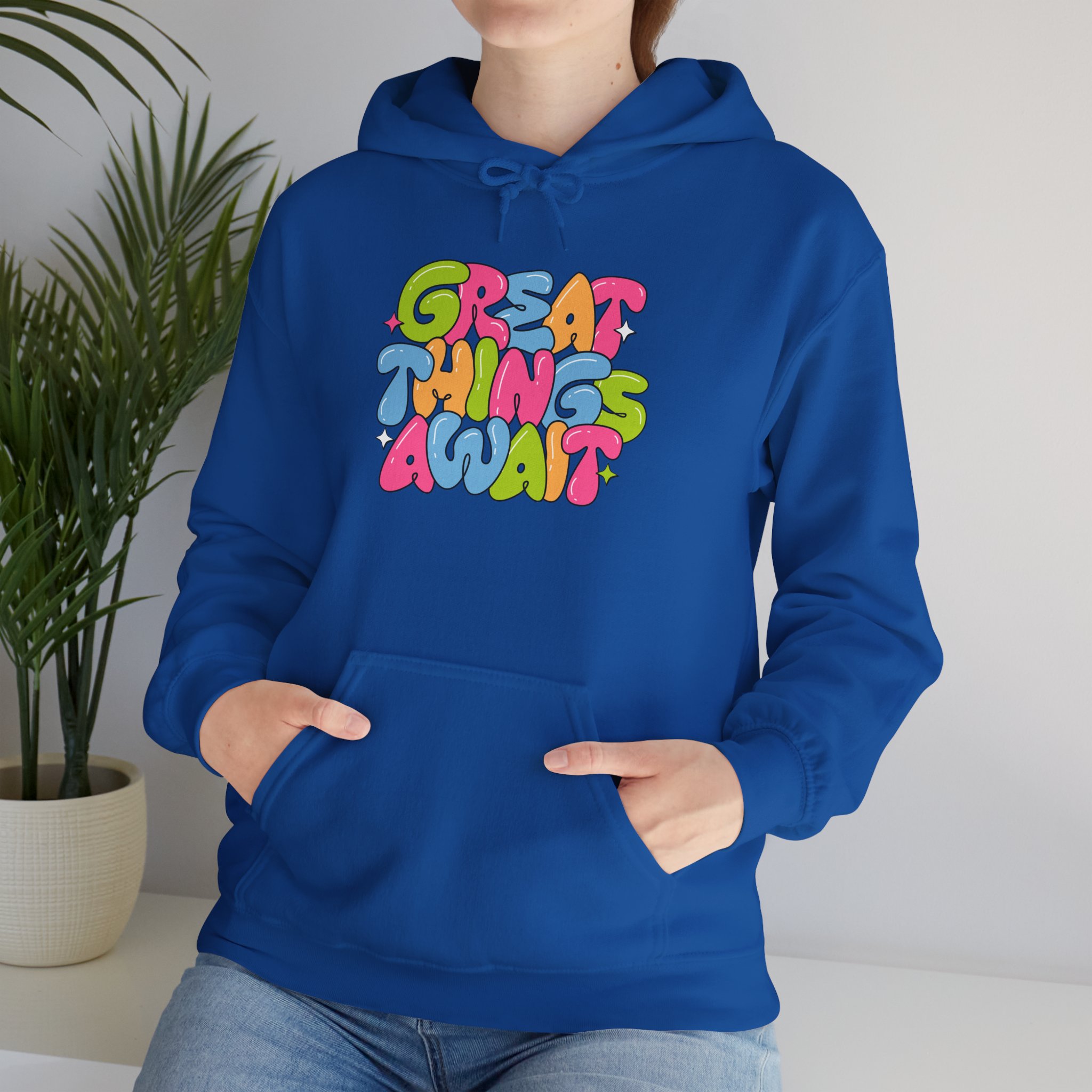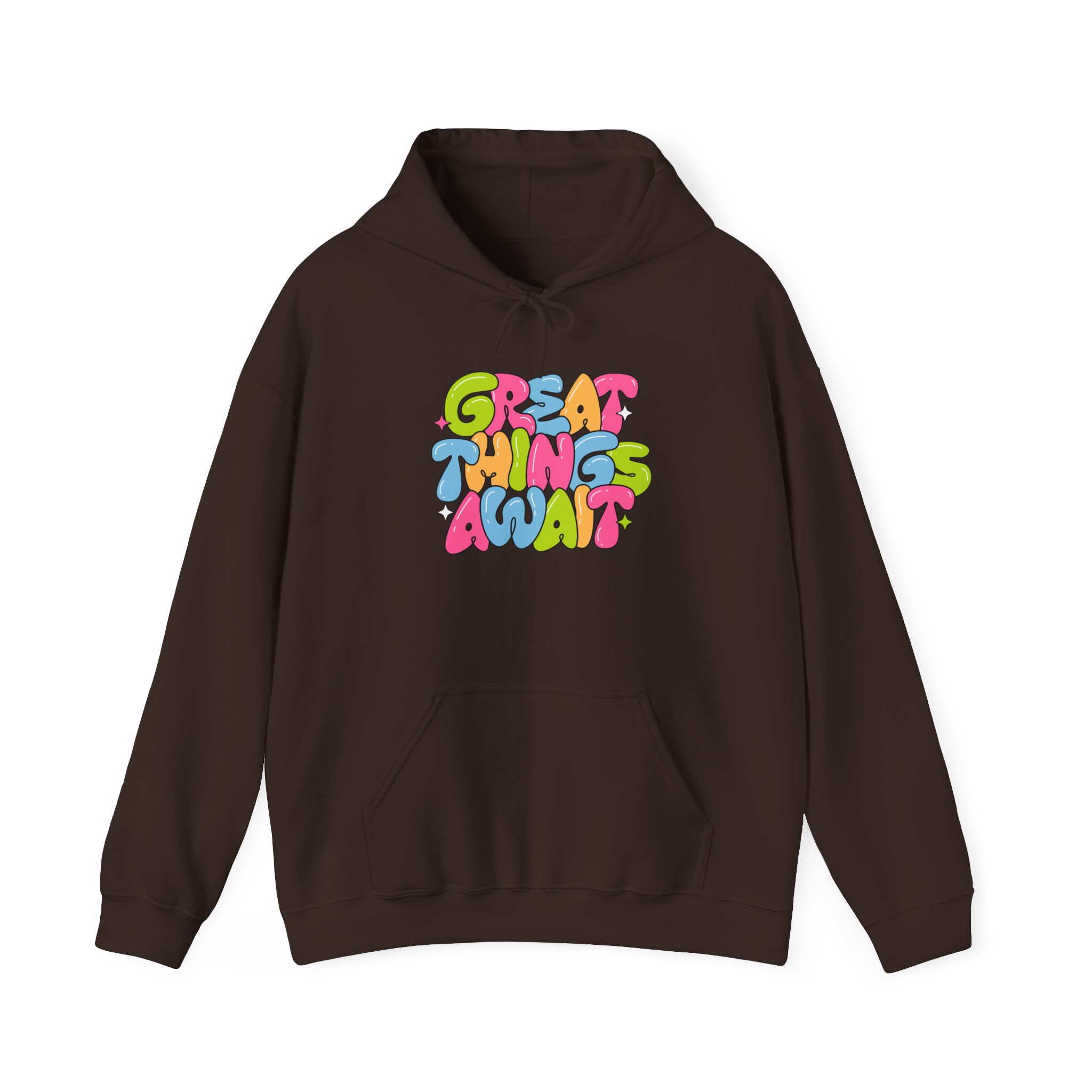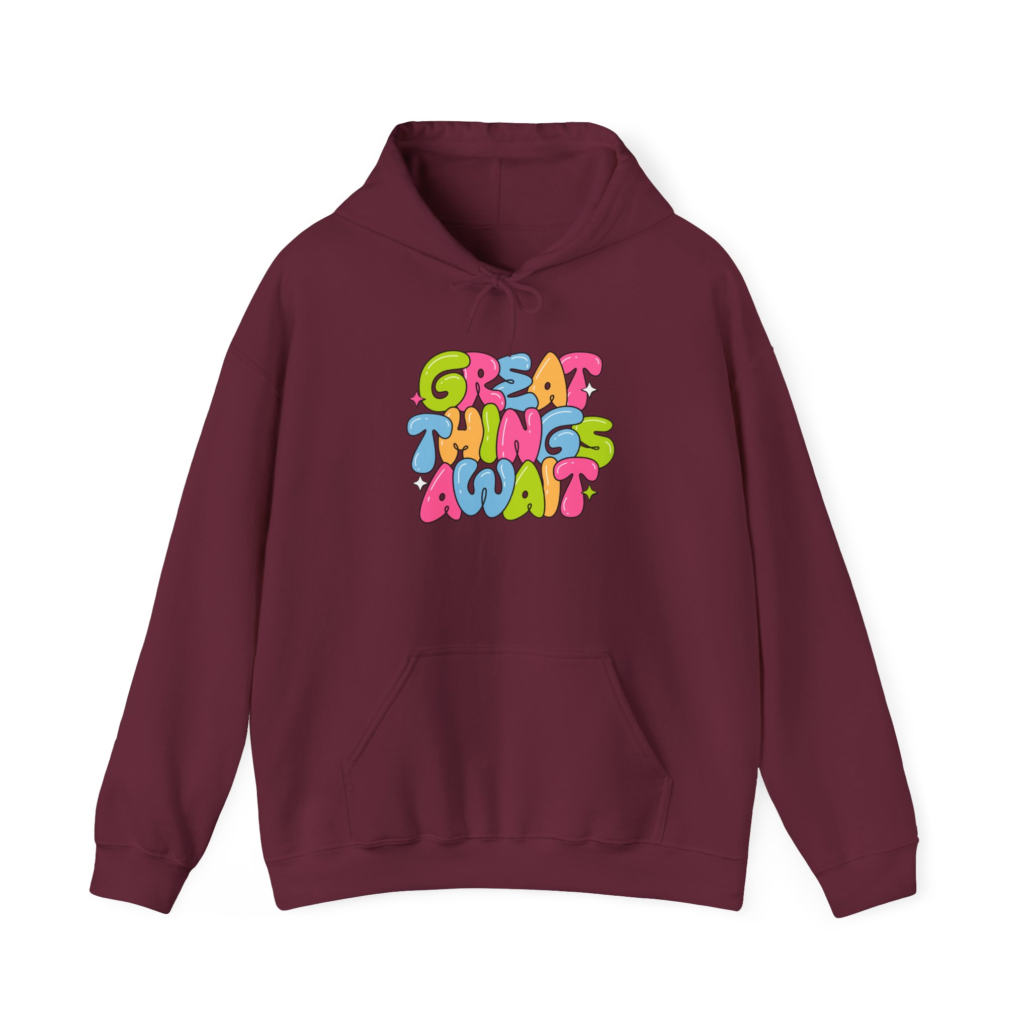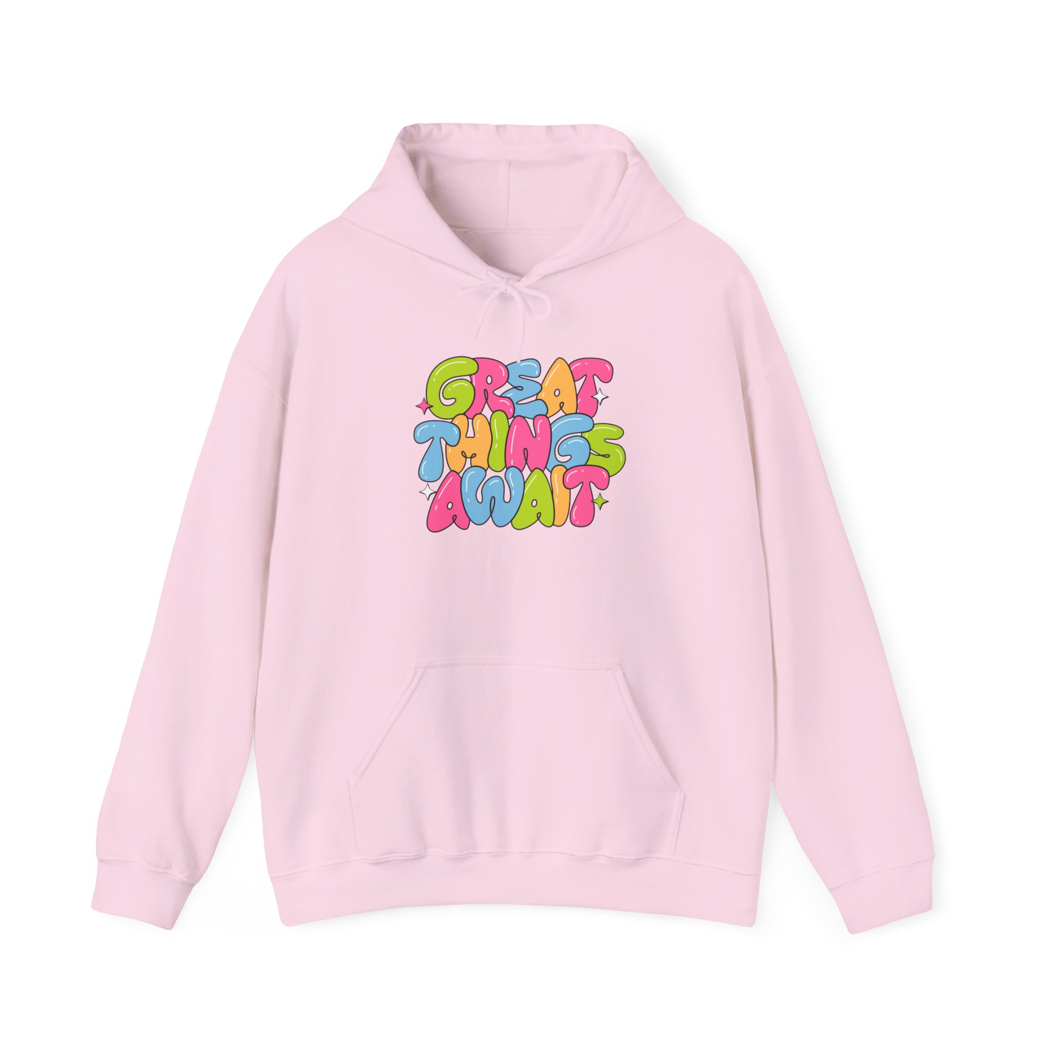 Hoodie — Colorful ‘Great Things Await’ Positive Graphic Pullover